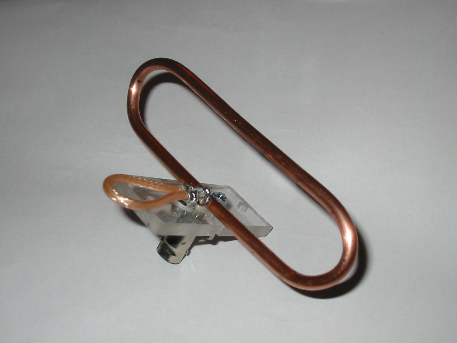 The folded dipole tok a few tweaks to get right, using a broom handle and file handle as the hard round surfaces to bend the copper on. It's mounted on a piece of prespex, to which the BNC connector is also fastened; the dipole is simply well soldered to the connector pin. This close-up shows the balun which matches the coax to the folded dipole.