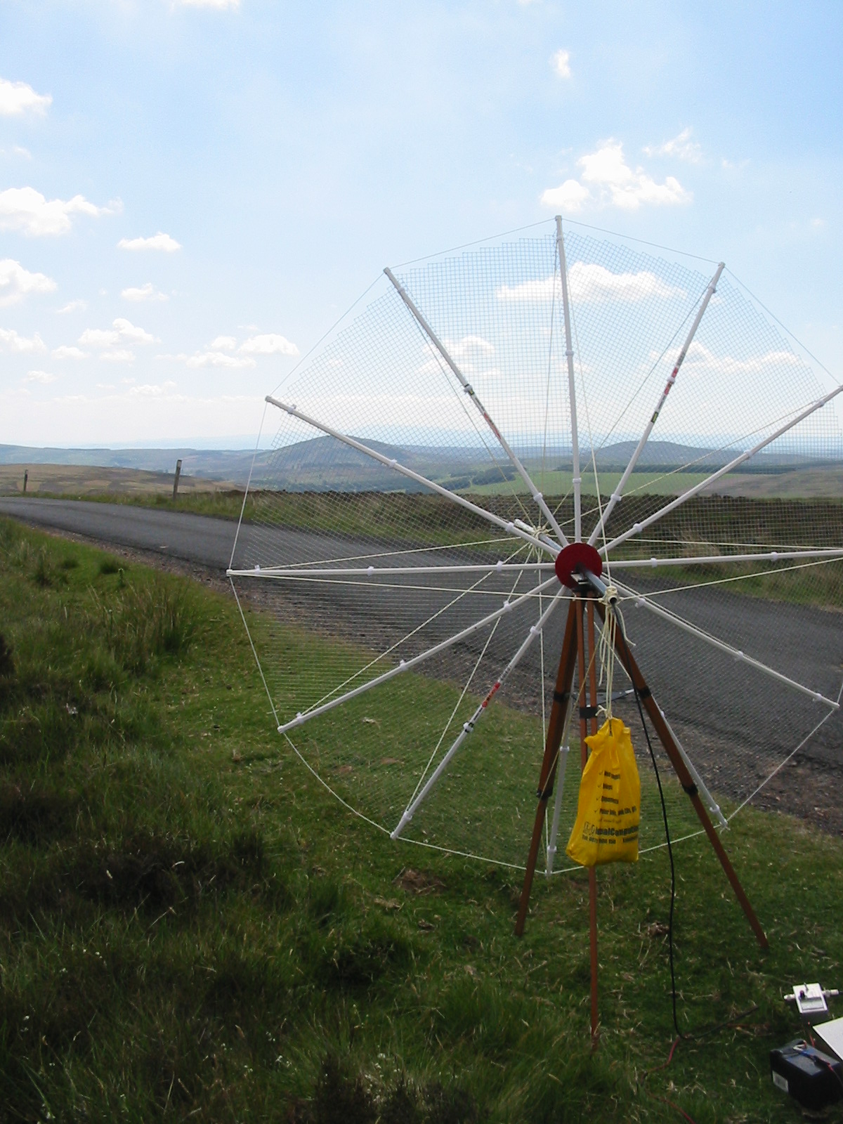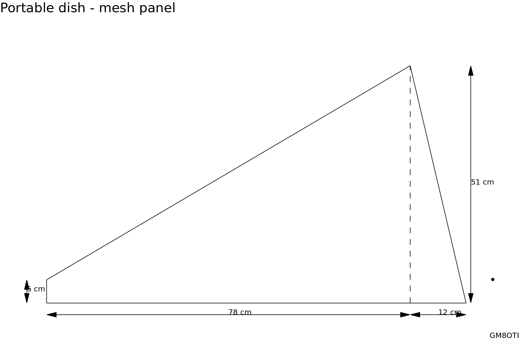 I had seen a great design for a dish antenna with stressed struts to form the surface in the International Microwave Handbook (2nd edition, 2008). However it was very well engineered in metal, and I don't have the facilities to do that. So I decided to see what I could do using easily available materials from the local DIY store.This portable dish was written up and published in Practical Wireless, October 2011. You may be able to get a copy of the article which has full details from Practical Wireless.