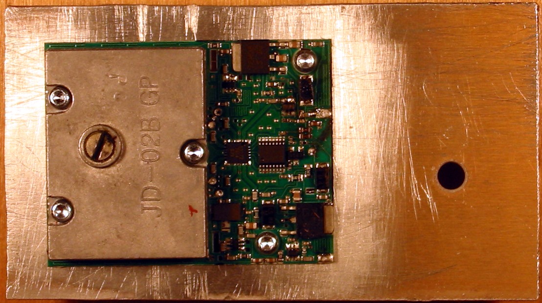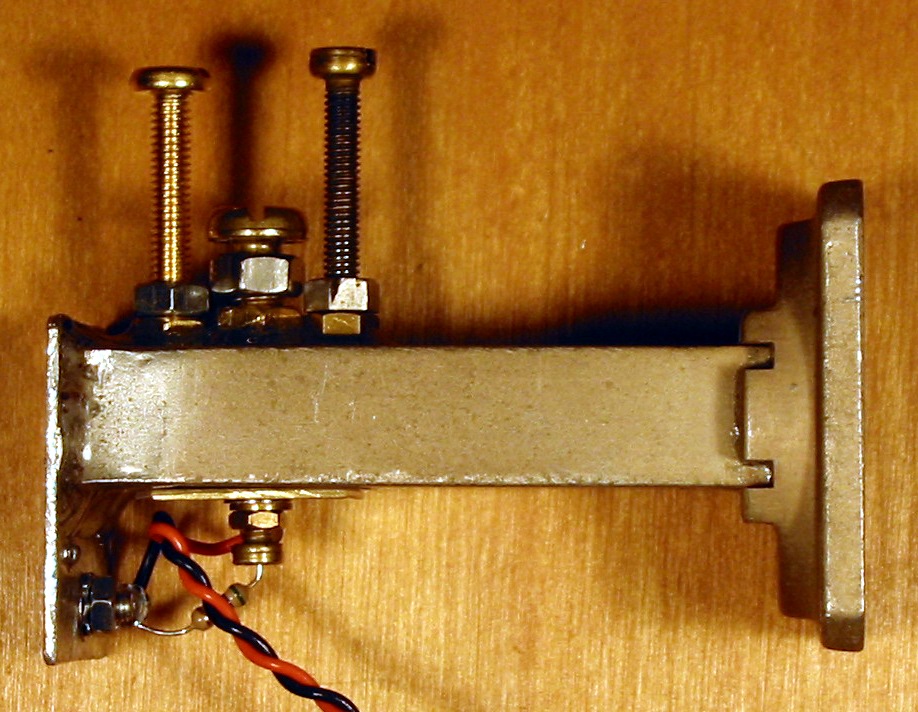 The cavity is closed by a pice of aluminium, soldered on to the (aluminium) waveguide using "Alusol" - I found a supplier of small quantities on Ebay, since I didn't want to buy kilos of the stuff. The middle screw assembly is the diode mount, with connection below, and the screw nearest the closed end is for tuning. The screw nearest to open waveguide end is for matching. Once assembled it looks like this:
