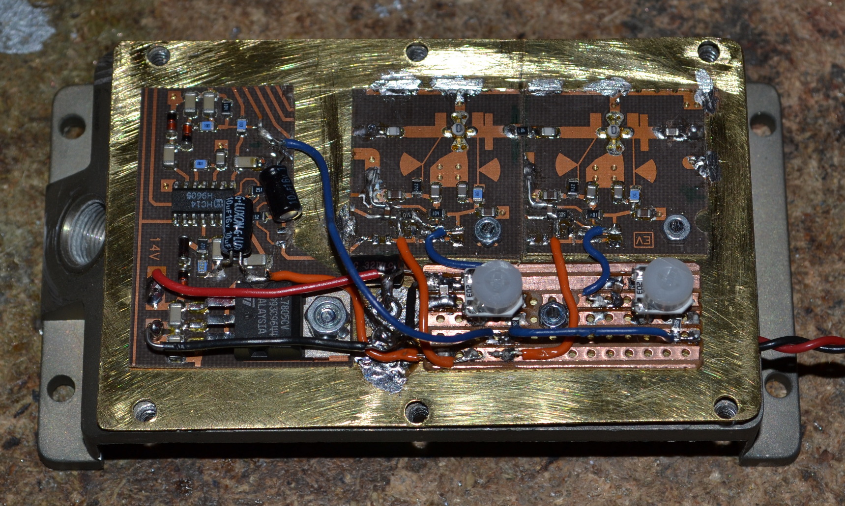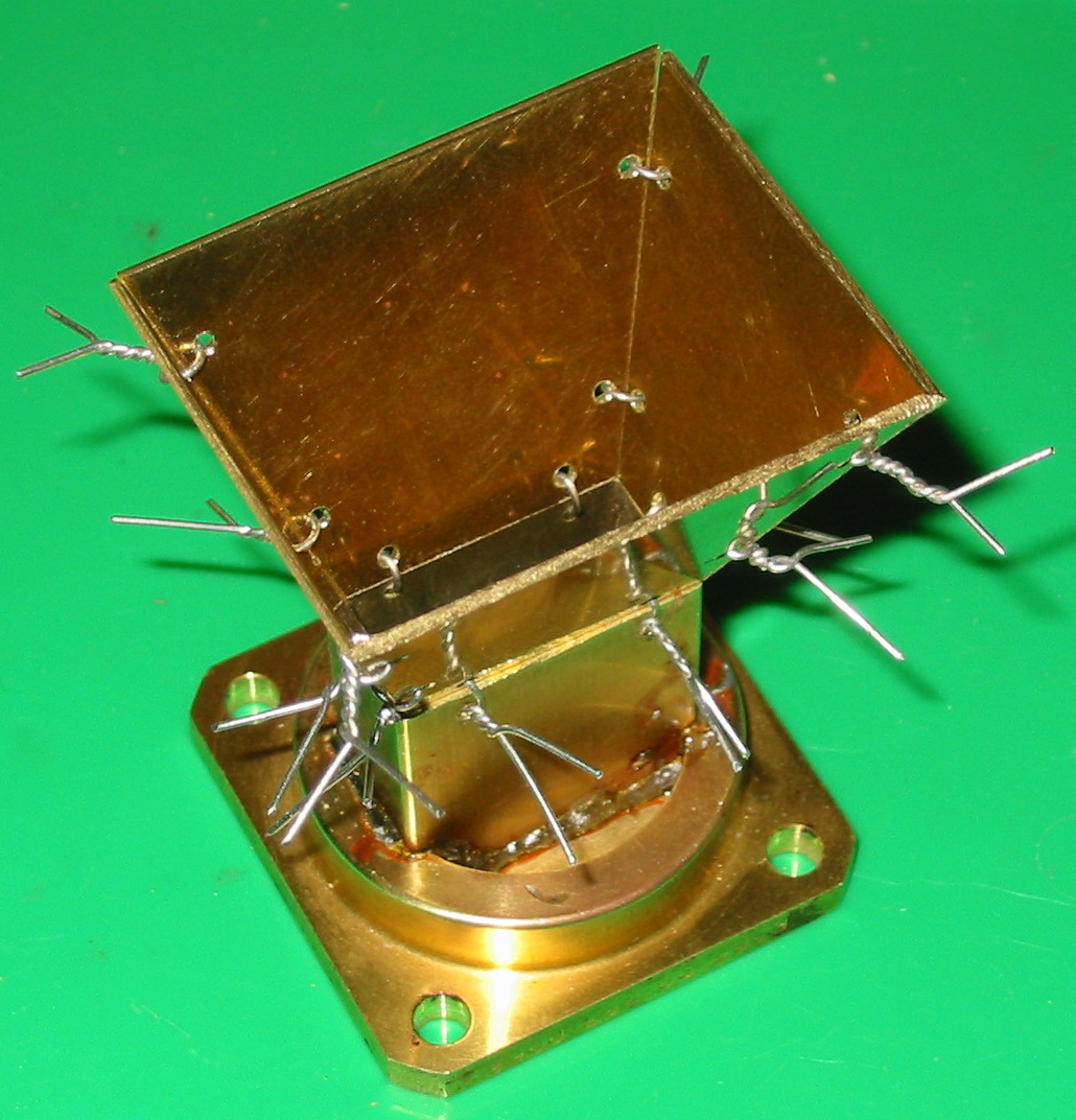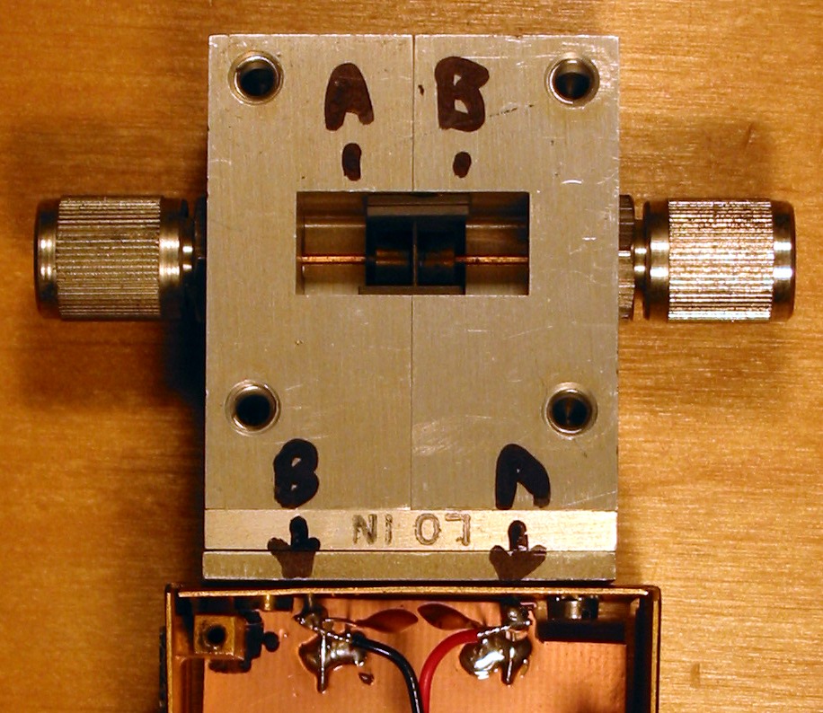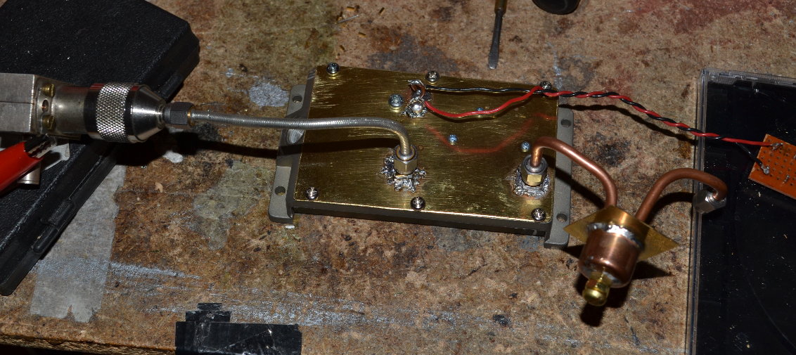 Here (below) is the signal input side of the head. You can see the brass probes which connect to the detector diodes, mounted in the screw attachments on either side. As it happened, it came with two diodes or reverse polarity, which is lucky as I can rectify the outputs separately and add the voltages together, making the device twice as sensitive!