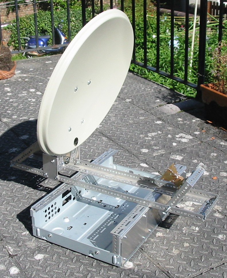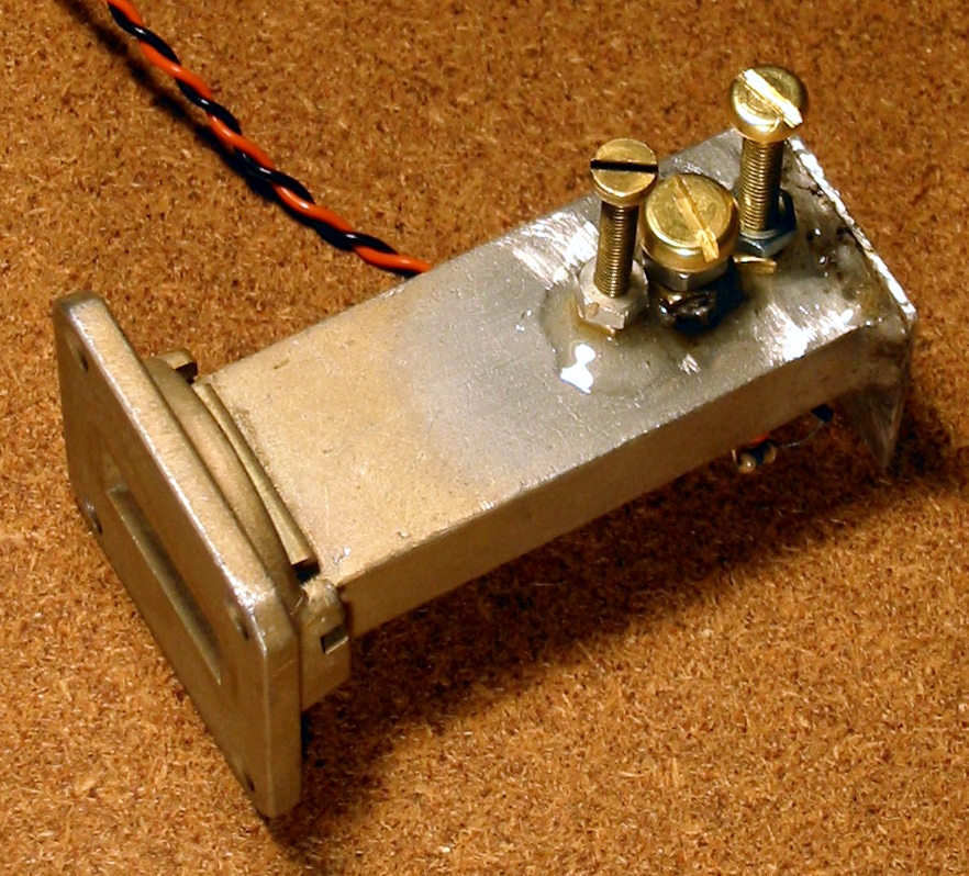 The simplest way is a suitable diode in a bit of waveguide, with a decoupling capacitor and meter attached. My thoughts had started to go along the lines of "how can I help other people with similar equipment limitatons to me to get going ..." but then I'm in a hurry so all short cuts will be taken. I'll look at home made waveguide et cetera later!At some rally I picked up (£1?) a device which was originally a mixer - it's a machined block with short waveguide at right angles on either side of two diode mounts, and fortunately had the diodes in. Hopefully at least one will still work. There was a box of IF electronics attached to the diode non-grounded ends. The waveguide was for signal in one side, LO in the other side. I'm going to blank off the LO end with a bit of copper plate, and assume the extra bit of waveguide at right angles won't do too much harm to the ability of it to detect microwaves. It has standard flange screw holes so can usefully be attached to a short horn or anything else once I've knocked it up into a device with the meter attached.